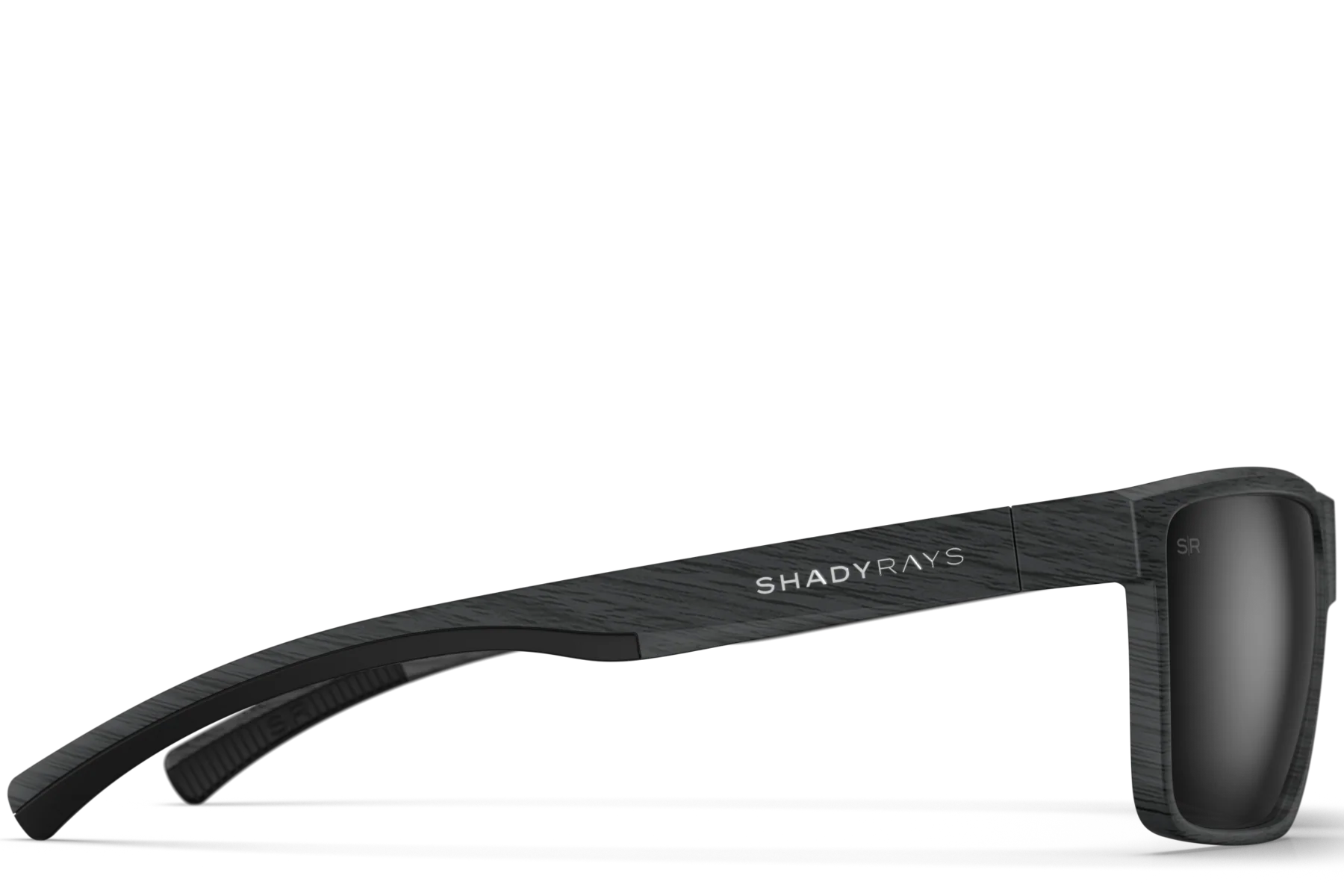 - Matte black wood grain pattern TR-90 frame with raised logos.